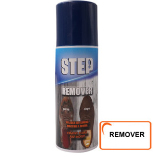 Remover Spray Step. Smacchiatore a secco per pelle, camoscio e tessuti. Rimuove le macchie più difficili come olio, grasso e muffa. Spruzzare direttamente sulle macchie. Lasciare asciugare e rimuovere la polverina con una spazzola. Confezioni da: 200 ml x 12 pz